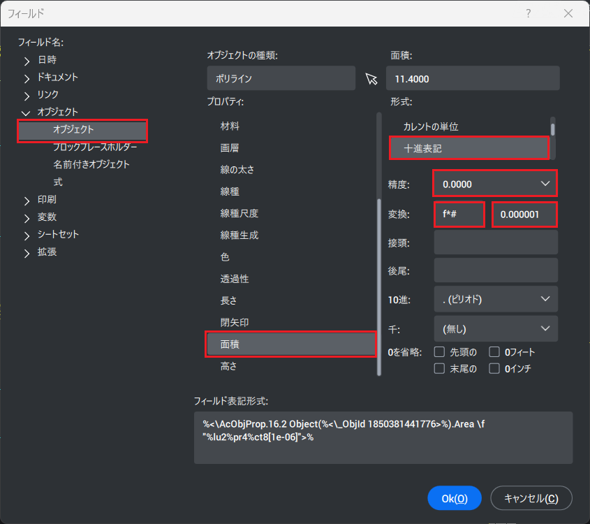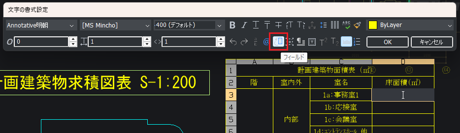 フィールドを使用して、ハッチングの割付範囲や、閉じたポリラインなどから、面積を表示することができます。