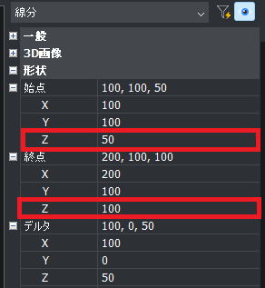 その場合は、プロパティ管理で始点、終点のZ値(高さ)を変更します。