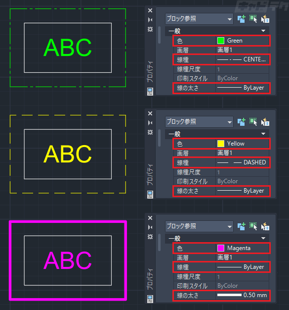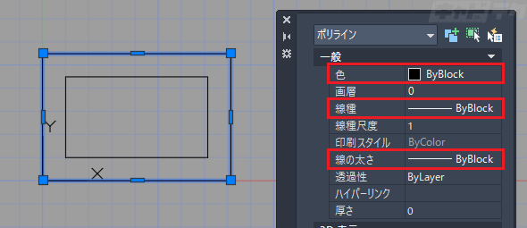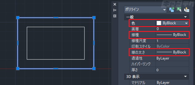 ■例:外枠の色・線種・線の太さをByBlockに設定、内枠はすべてByLayer(ByLayer:画層の設定に従う)