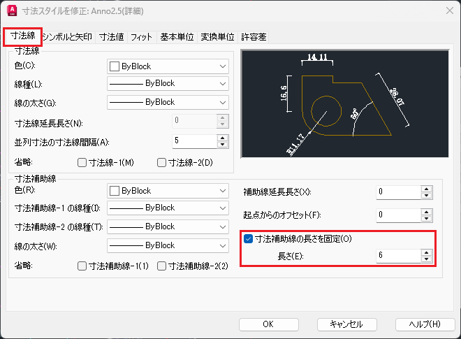 [寸法線]タブ→[寸法補助線の長さを固定]を有効→[長さ]に値を入力