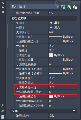 [線分と矢印]欄の[寸法補助線固定]をオン→[寸法補助線長さ固定]に値を入力